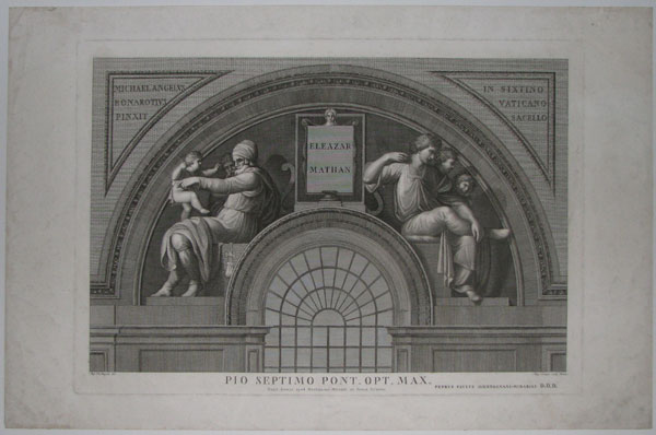 Two figures from the Hebrew Bible: Eleazar (Elazar) was the second Kohen Gadol (High Priest), succeeding his father Aaron. He was a nephew of Moses. Nathan (fl. c.1000 BC) was a court prophet who lived in the time of King David and Queen Bathsheba. Dedication to Pope Pius VII to lower margin. From a series of plates reproducing the famous frescos by Italian Renaissance painter Michelangelo (1475 - 1564) in the Sistine Chapel, Vatican City, Rome.