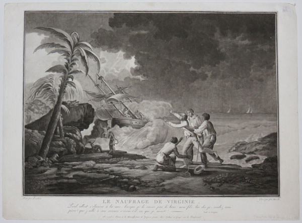 The shipwreck. Paul watches on in horror from the shore as a ship is hurled by a huge wave towards rocks on the tropical island of Mauritius; he is restrainted by one white and two black companions. Virginia and a black slave stand on the deck of the doomed ship. The most famous ship name in the history of Mauritius is the slaveship St. Géran which, whilst bringing colonists, was shipwrecked in 1744 on fringing reef of island's northeast coast. Only nine survived the wreck and it inspired the novel Paul et Virginie by Bernadin de St. Pierre. In the novel Virginie, out of modesty, refuses to remove her clothes so that the sailor can carry her to shore and is consequently drowned. On shore grief stricken Paul dies soon afterwards. The novel was written on the eve of the French Revolution by Jacques-Henri Bernardin de Saint-Pierre, and it records the fate of a child of nature corrupted by the false, artificial sentimentality that prevailed at the time among the upper classes of France. See Ref: 18009 for a rare coloured version of the scene.