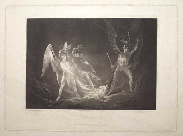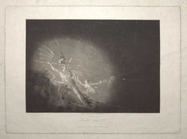 Satan at the gates of Hell, raising his spear to strike Death, a dark monstrous figure of whom only the crown, eyes, claw and spear are visible, while Sin, a woman whose snaky tail is hidden in her garment and the darkness, rushes between them with her arms outstretched, to stop Satan attacking his son. One of a series of plates commissioned by American publisher Septimus Prowett to illustrate at edition of 'Paradise Lost' by John Milton (1608-74). Balston 4 D. CW 55.