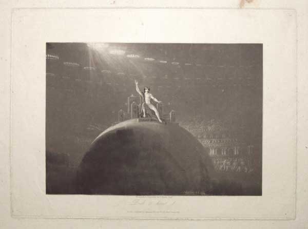 Satan presiding at the Infernal Council; Satan, with his right arm raised, sitting on a throne set on a sphere, raised in the centre of a building crowded with rebel angels on tiered seats, lit by rings of light. One of Martin's finest mezzotints. One of a series of plates commissioned by American publisher Septimus Prowett to illustrate at edition of 'Paradise Lost' by John Milton (1608-74). Balston 4 D. CW 54.
