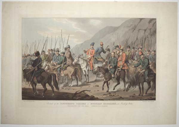 A party of Ural Cossacks with their Ataman David Martemianovich Borodin (1760-1860) during the Austro-Russian Italian and Swiss Campaign in 1799, led by the Russian Marshal Alexander Suvorov. The original painting by Carl Adolph Heinrich Hess (1769-1849) was sold by Christies in 2003, with the identification of Borodin from Nicholas Touroverov's 'Cossacks in Works by Foreign Artists', 1939. Not in Abbey. See Christie's Live Auction 1286, Lot 87 for the painting.
