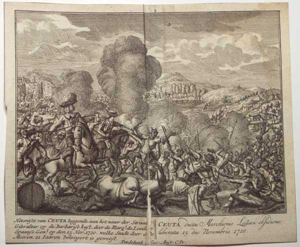A scene of the siege of Spanish city Ceuta (1694-1720) on the North African coast by Moroccan forces. On the left, the Marquis of Lede directs the attack on the besiegers on 15 November 1720.
