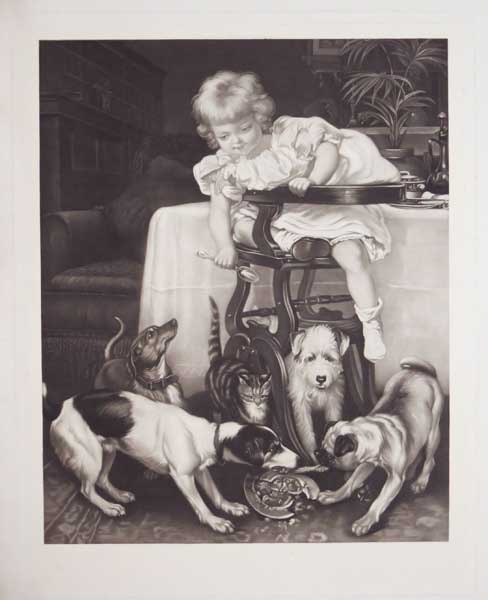 Eating from the child's plate which has dropped to the floor (and cracked) is a pug, Scottish terrier, fox terrier and another dog; also a tabby-cat.