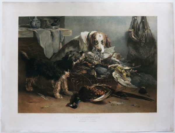 Three dogs, including a poodle, before an array of dead fowl. One dog holds a brush in its mouth, suggesting the dogs belong to the artist. See Landseer Tate Gallery pg 200