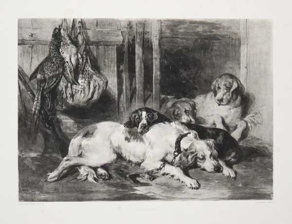 A black labrador retrieving a pheasant on a shoot. By Reuben Ward Binks (English, 1880 - 1950), gun dog portraitist and illustrator. He accepted royal commissions on a regular basis. Among others, Binks completed portraits of the Prince of Wales' Cairn Terriers, Cora, John and Hamish; the Duke of York's Labrador Retriever, Glen; and the Duke of Gloucester's rough-haired Fox Terrier, Kris. Indeed, portraits of royal dogs which the artist completed during the reigns of Queen Victoria, King Edward VII and King George V are hung throughout the royal residence at Sandringham. 'Warwick Galleries Artists Proof' blindstamp lower right. Guichard: pg.26.
