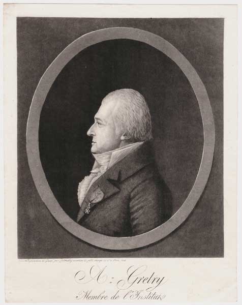 Profile portrait of André Grétry (1741-1813), Belgian composer of opéras comiques. Frenchman Gilles-Louis Chrétien invented the 'physionotrace' in the 1780s to draw the outlines of silhouettes, which were then completed by the artist and transferred to aquatint printing plates using another pantograph. The published of this print, Edme Quenedey, was Chrétien's first business partner: a drawing he made of the device in 1788 is now in the Bibliothèque Nationale de France..