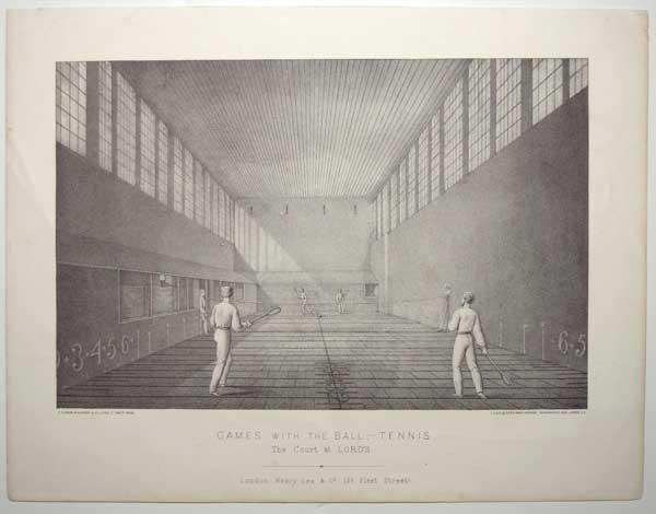 A game in progress inside the real tennis court at Lord's. At the request of MCC members a tennis court was built in 1839, soon becoming the venue for major championship and exhibition games. From 'The Book of Field Sports and Library of Veterinary Knowledge' by Henry Downes Miles.