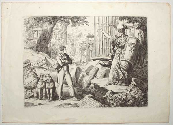 The artist, Bartolomeo Pinelli (1781-1835), stands in the Roman Forum, with a figure of Rome holding a shield decorated with Romulus and Remus sucking the she-wolf. This was the frontispiece to Pinelli's series of 100 plates illustrating the the history of Republican Rome, as told in Charles Rollin's 'Istoria Romana'.