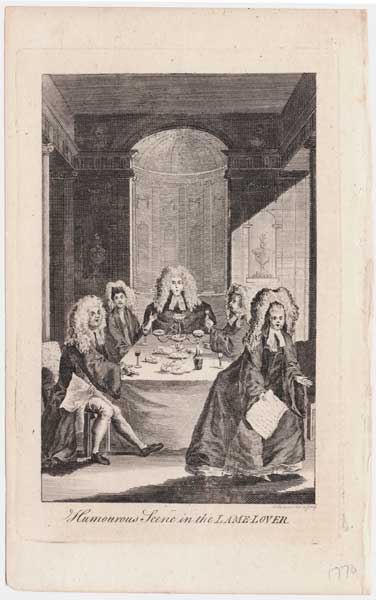 A scene from 'The Lame Lover, a three-act comic play by Samuel Foote, about Sir Luke Limp, a disabled man who pretends to be in love with a wealthy widow for financial gain. Foote, who wrote the play while recuperating from the amputation of his leg following a riding accident, played Limp in the original production