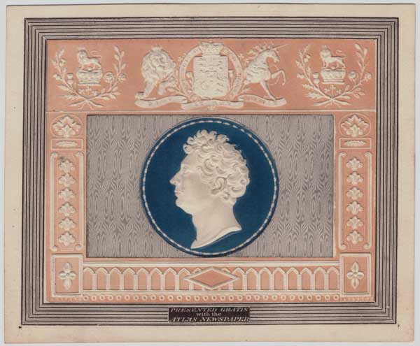 A cameo portrait of George IV within an embossed design including the Royal Arms. The Atlas Newspaper ran from 1826 - 1869. According to the Victorian and Albert Museum, this is believed to be the first free gift with a newspaper. V&A E.452-1998.