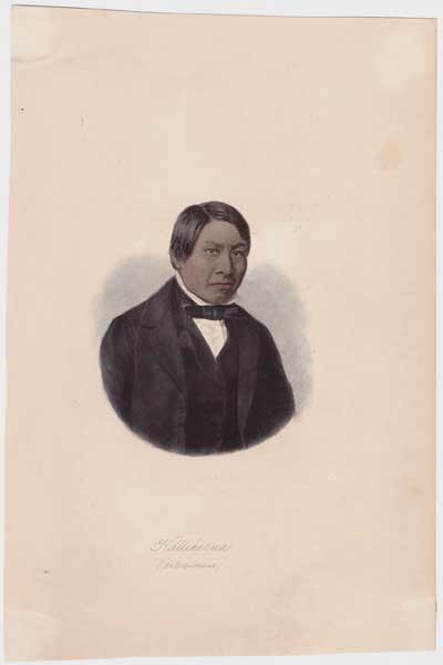 Qalaherriaq (c. 183-56, baptized as Erasmus Augustine Kallihirua), an Inughuit hunter from Cape York, Greenland, who worked as an interpreter by the crew of HMS Assistance during the search for Franklin's lost expedition in 1850. Afterwards he was trained as a missionary in England but he died of tuberculosis a year after his return to Canada. From 'Natural History of Man' by Dr James Cowles Pritchard.