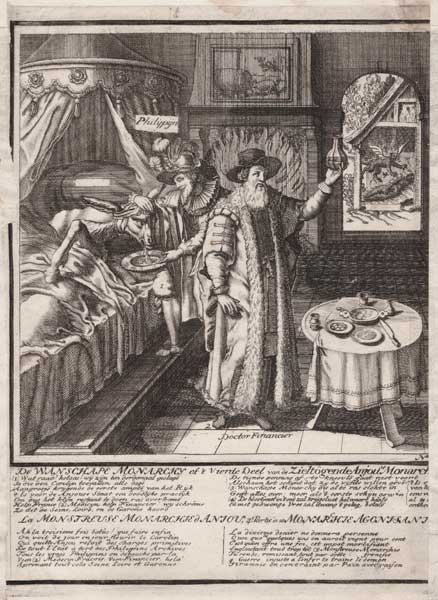 Philip V of Spain helps a donkey to vomit while a 'Doctor Financier' examines a urine sample. Through the window a demon approaches a sleeping woman. A satire of the state of Spain during the War of the Spanish Succession, 1701-14. From 't Lust-Hof van Momus, Beplant met de voornaamste Gewassen van Mars in Europa'. Wellcome 17533i.