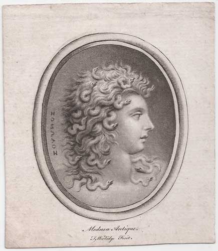 Bust portrait of Medusa in profile to the right, mouth slightly open and within an oval medallion. In Greek mythology, Medusa, was one of three Gorgon sisters and depicted as a woman with snakes for hair, whose terrifying gaze could turn anyone who looked at her into stone. Medusa was beheaded by the Greek hero Perseus, who then used her head, which retained its ability to turn onlookers to stone, as a weapon until he gave it to the goddess Athena to place on her shield. Thomas Worlidge (1700 - 1766), 'the English Rembrandt' and a pupil of Alessandro Maria Grimaldi, whose daughter Arabella he married.