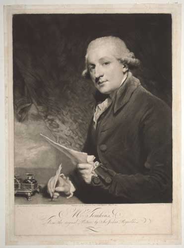 Portrait of Thomas Tomkins (1743 - 1816), calligrapher and author of ‘Rays of Genius' and other works on penmanship. He sits to left at a small table with inkstand, eyes to front, holding paper in his left hand and a quill pen in his right; curtain behind. Whitman 561, ii. Hamilton p.69, iii. Ex: collection of The Hon. Christopher Lennox-Boyd.