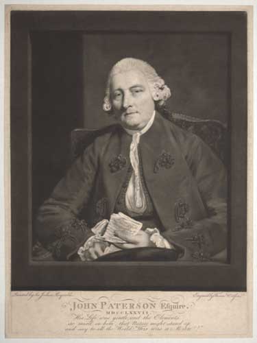 A portrait of John Paterson (1705-89), painted by Joshua Reynolds in 1777 on a commission from architect Robert Mylne. As Chairman of the Committee of Ways and Means 1765-8, Paterson played a key role in securing the finance for Mylne's Blackfriar's Bridge. The bridge is referenced by the paper Paterson holds in the completed plate (but not present here): 'A plan to raise 300,000 £ for the purpose of completing the bridge at Blackfriars and redeeming the toll thereon, and embanking the north side of the Thames'. Paterson was the first Clerk of the Barbers' Comany after a break from the Surgeons in 1745, becoming Master in 1776. The company acquired the original painting in 1890. In CS: 29. before i of ii. Goodwin 30, before i of ii. Hamilton p.54, before i of ii. Ex: collection of The Hon. Christopher Lennox-Boyd, his state i of iii.