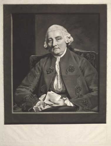 A portrait of John Paterson (1705-89), painted by Joshua Reynolds in 1777 on a commission from architect Robert Mylne. As Chairman of the Committee of Ways and Means 1765-8, Paterson played a key role in securing the finance for Mylne's Blackfriar's Bridge. The bridge is referenced by the paper Paterson holds: 'A plan to raise 300,000 £ for the purpose of completing the bridge at Blackfriars and redeeming the toll thereon, and embanking the north side of the Thames'. Paterson was the first Clerk of the Barbers' Comany after a break from the Surgeons in 1745, becoming Master in 1776. The company acquired the original painting in 1890. CS: 29. i of ii. Goodwin 30, i of ii. Hamilton p.54, i of ii. Ex: collection of The Hon. Christopher Lennox-Boyd, his state ii of iii.