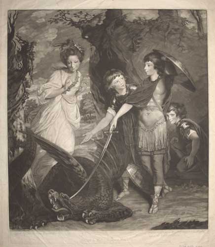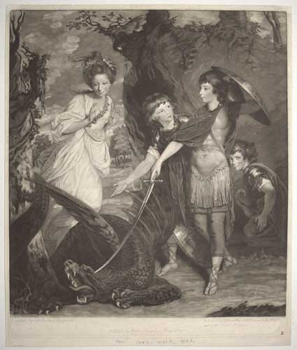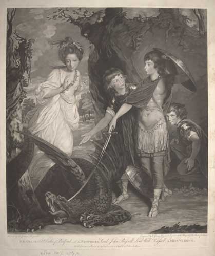 Francis Russell, 5th Duke of Bedford (1765-1802), dressed as St. George, standing above the dead dragon, with his brothers John (1766-1839, 7th duke) and William (1767-1840), with Henrietta Vernon (1745-1828, Countess Grosvenor) as Sabrina. CS: 8, ii of ii. Goodwin 69, ii of ii. Hamilton p.8. Ex: collection of The Hon. Christopher Lennox-Boyd.