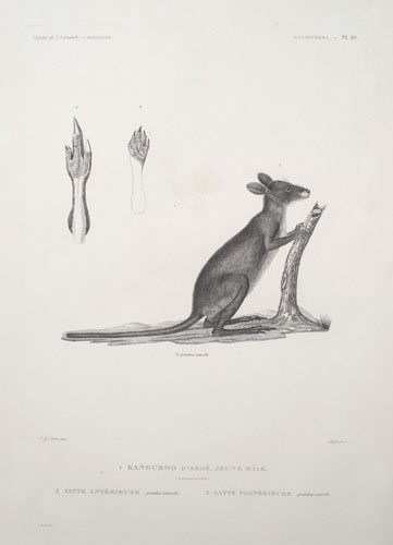 Kanguroo d'Aroé, jeune mâle. (Nouvelle Guinea.) Voyage de la l'Astrolabe. - Zoologie. Manniféres. - Pl 20.