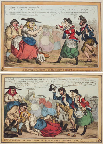 [William Heath ]Paul Pry Esqr. Signature. Pub. April 1829, by T. McLean 26 Haymarket where Caricatures are daily Publishing. A pair of hand-coloured etching. The first with J. Whatman 1828 watermark; Each plate: 260 x 370mm (10¼ x 14½"). A pair of satirical scenes showing Eldon and Wellington as brawling market women oppose each other on the Catholic Relief Bill. The first plate shows the pair preparing to fight, the second shows Eldon lying on the floor having been knocked down by Wellington. BM Satires 15721 & 15723.