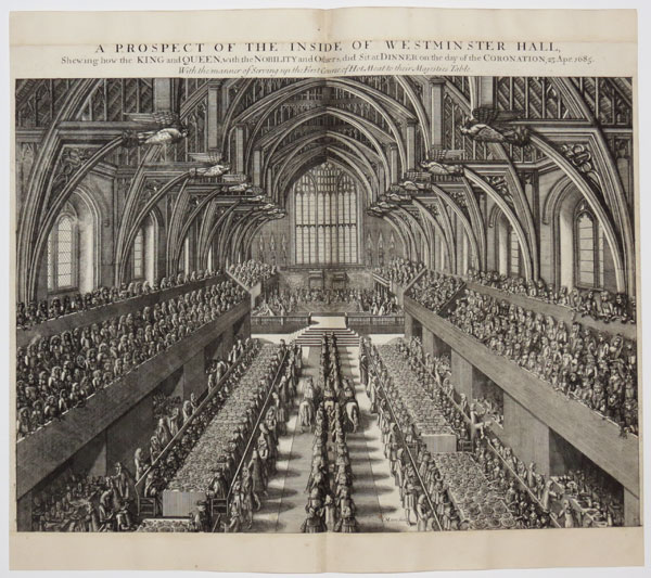 Banquet at Westminster Hall, held as part of the coronation of James II and Mary of Modena on 23 April 1685. Illustration to Francis Sandford, 'The history of the coronation of the Most High, Most Mighty, and Most Excellent Monarch, James II, by the grace of God, King of England, Scotland, France, and Ireland, defender of the faith, &c. And of his royal consort, Queen Mary' (London, 1687). Sandford worked for two years with his fellow herald Gregory King to produce this record of the coronation rituals, which included twenty-seven lavish engravings of the sumptuous feasts, processions and fireworks in a style previously unseen in the British Isles. Unfortunately for Sandford, the book appeared shortly before the Glorious Revolution which saw James II flee the country, and the authors barely cleared their expenses.