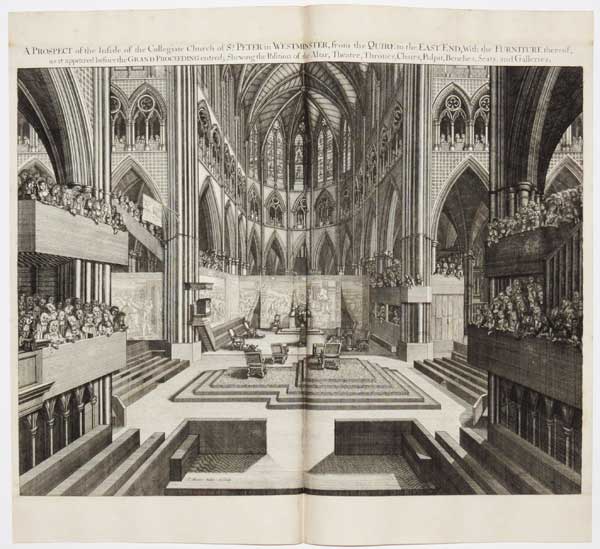 Westminster Abbey (formally titled the Collegiate Church of St Peter at Westminster) as arranged for the coronation of James II and Mary of Modena on 23 April 1685. Illustration to Francis Sandford, 'The history of the coronation of the Most High, Most Mighty, and Most Excellent Monarch, James II, by the grace of God, King of England, Scotland, France, and Ireland, defender of the faith, &c. And of his royal consort, Queen Mary' (London, 1687). Sandford worked for two years with his fellow herald Gregory King to produce this record of the coronation rituals, which included twenty-seven lavish engravings of the sumptuous feasts, processions and fireworks in a style previously unseen in the British Isles. Unfortunately for Sandford, the book appeared shortly before the Glorious Revolution which saw James II flee the country, and the authors barely cleared their expenses.