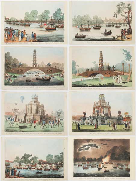 [The Grand Jubilee Celebrations in London's Parks.] View of the Bridge and Pagoda, from the Canal, St James's Park.[&] The Chinese Pagoda and Bridge in St James's Park (previous to the Fire.) [&] The Fortress (which inclosed the Grand Pavillion.) in the Green Park; with the ascent of the Balloon. [&] The Grand Pavillion in Green Park. [&] The View in Hyde Park, with the Fleet at Anchor, on the Serpentine River. [&] The Jubilee Naval Action on the Serpentine in Commemoration of the Battle of the Nile. [&] The Action between the British & American Frigates on the Serpentine, Hyde Park, 1st August, 1814. [&] Scene on the Serpentine, Hyde Park, on the Night of the Grand Jubilee, Aug.t 1. 1814.