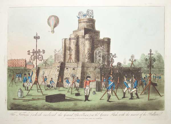 On 1st August 1814 a series of events celebrating both the end of the Napoleonic Wars and the centenary of Hanoverian rule in England. In St James's Park a Chinese bridge with a pagoda was built over the lake; in Green Park a revolving Temple of Concord was constructed by Sir William Congreve (of rocket fame); and in Hyde Park naval battles with miniature frigates were fought (the 'Nile' and 'Trafalgar' against the French and a third against the Americans, a reminder that Britain was still fighting the War of 1812). The battles were successful events: however the pagoda in St James's Park was set alight by fireworks, killing one and injuring another; and the balloon ascent, by James Sadler (1753-1828, the first English balloonist) did not go as planned and he had to make an emergency landing.