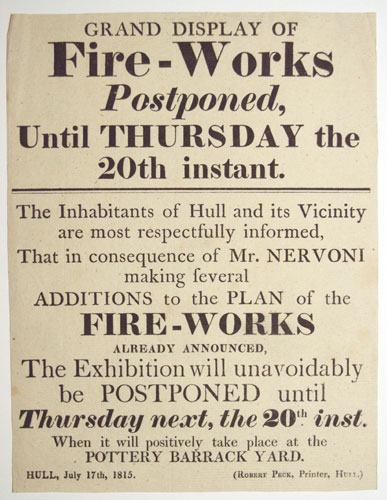 Grand Display of Fire-Works Postponed, Until Thursday the 20th instant. The Inhabitants of Hull and its Vicinity are most respectfully informed, That in consequence of Mr. Nervoni making several Additions to the Plan of the Fire-Works Already Announced, The Exhibition will unavoidably be Postponed until Thursday next, the 20th Inst. When it will positively take place at the Pottery Barrack Yard.
