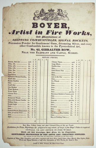 Boyer, Artist in Fire Works, and Manufacturer of Shipping Combustibles, Signal Rockets, Percussion Powder for Gentlemens' Guns, detonating Silver,, and every Combustible known to the Pyrotechnical Art, No 42, Gibraltar Row, Near the Elephant and Castle, Surrey.
