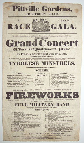 Pittville Gardens, Prestbury Road [Cheltenham]. A Grand Race Gala [...] On Tuesday Evening next, July 19th, 1831 [...]After the Concert, there will be a Grand Gala Fete, and Superb Display of Fireworks Ona very extensive Scale; on which Occasion the Gardens will be most brilliantly Illuminted with Variegated Lamps [...]