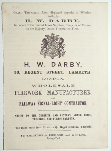Grand Triumphal Arch displayed opposite to Windsor Castle, by H.W. Darby, In honour of the visit of Louis Napoleon, Emperor of France, to her Majesty, Queen Victoria the First. H.W. Darby, 98, Regent Street, Lambeth, London, Wholesale Firework Manufacturer, and Railway Signal-Light Contractor. Artist to the Nobility and Gentry's Grand Fetes, Theatres, and Public Gardens. For many years the Sole Artiste to the Royal Gardens, Vauxhall.