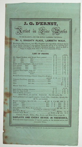 J.G. D'Ernst, Artist in Fire Works to His Majesty, and the Royal Gardens, Vauxhall. No 5, Doughty Place, Lambeth Walk.