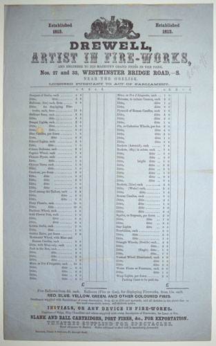 Drewell, Artist in Fire-Works, and Engineer to his Majesty's Grand Fetes in the Park, Nos 27 and 33, Westminster Bridge Road, - S. Near the Obelisk. Licensed Pursuant to Act of Parliament.