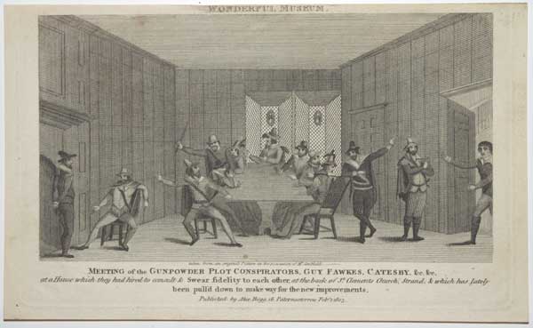 Meeting of the Gunpowder Plot Conspirators, Guy Fawkes, Catesby, &c, &c. at a House which they had hired to consult and Swear fidelity to each other, at the back of St Clements Church, Strand, & which has lately been pull'd down to make way for the new improvements.