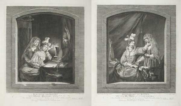 Two scenes: a woman writes a love letter by candlelight; and another woman receives a love letter. The painter was Juan Pantoja de La Cruz (1553-1608), court painter to Philip II and Philip III of Spain. The engraver was German Johann Sebastian Müller (1715-92), who emigrated to England in 1744, anglicising his name to John Miller.