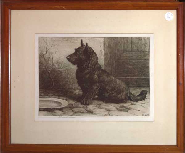The image shows the black terrier laid down with the white terrier sat in front of him. The label reads: '''Hope'' (Cairn Terriers). A New Original Etching by Herbert Dicksee R.E.'. Herbert Dicksee and his family owned a variety of different breeds of dogs which enabled him to paint them from life, such as “Hope”. The Cairn is one of the native Scottish Breeds and from the 17th century had been used in the Western Highlands and the Isle of Skye to keep down vermin which were a threat to game. They often worked in small packs and they take their name from the Cairn - small outcrop of stones, common in the highland moors.