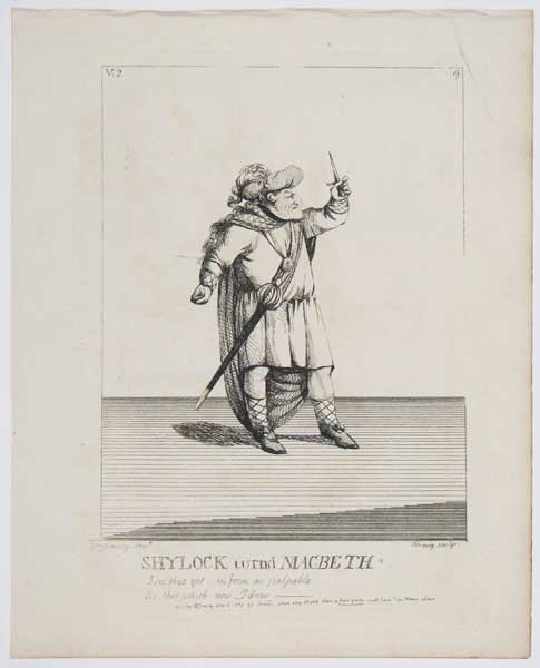 Caricature of Charles Macklin (1699? - 1797) as William Shakespeare's Macbeth, his dagger held up in his left hand, his head in profile to right. He wears a feathered hat, long hair, and Scottish dress: a large plaid, kilt, bare knees, and tartan stockings, a thistle badge hangs from his neck on a ribbon, a claymore (so-called) hangs at his waist. Macklin appeared on 3rd October 1773 as Macbeth, the part being played for the first time in Scottish dress, before a very hostile audience; they expected to be "spectators of his downfall", thinking his age would not allow him to go through the part to the end. "Lady Macbeth's modern robes by no means accorded with the habits of the other personages, and Mr. Macklin's flowing curls, like the locks of an Adonis, were unpardonably out of character." 'Macaroni and Theatrical Magazine', ii. 8, Oct. 1773. Before this time Macbeth was dressed as a modern military officer. The public treated him with great injustice, and accustomed to see him in comedy, and regarding his Shylock (in Shakespeare's The Merchant of Venice) as above criticism, refused to accept him in a heroic part. The mob would not be satisfied until Macklin was dismissed. Numbered '19' upper right. From an album of caricatures published by Mary Darly dated January 1776. It seems that her husband Matthew made the plates. BM Satires: 5175.