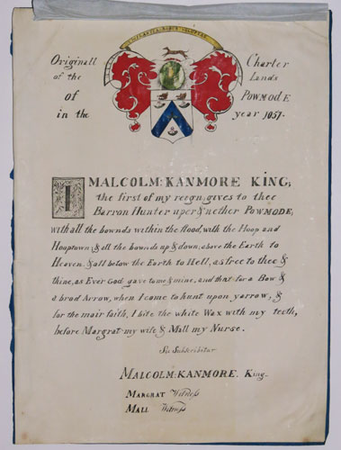 Originall Charter of the Lands of Powmode in the year 1057. I, Malcolm: Kaninore King; the first of my reign, give to thee Barron Hunter, uper & nether Powmode; with all the bounds within the flood, with the Hoop and Hooptown; and all the bouwds up & down; above the Earth to Heaven. & all below the Earth to Hell, as free to thee & thine, as Ever God gave to me and mine; and that for a bow and a broad arrow when I come to hunt upon Yarrow. And for the mair faith of this, I bite this white wax with my ain teeth, before Margaret my wife and Mall my Nurse. Sic Subacribitur, MALCOLM: KANMORE, King. MARGRATT, Witness. MALL Witness.