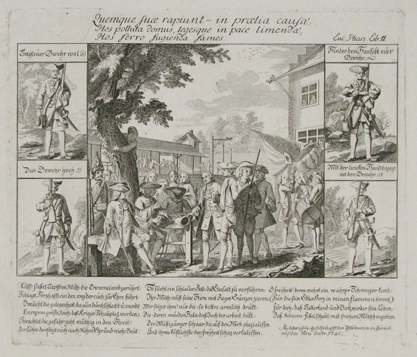 Military officers off duty, relaxing, drinking and playing games at the barracks. In the foreground, a groups of generals are involved in business with the sign-up of new and willing young officers. Surrounding the main image are four images of arms positions. One of the New Year’s broadsides produced by the military society of Zurich, Switzerland. This organization of elite officers founded in 1713, issued these broadsides every year from 1743 to 1797. They were produced only for the members of the Society, to provide an unusual view of how a proud army prepared for battle. From: Militärische Gesellschaft der Pförtneren, Zürich. Neujahrsblätter. Zürich, 1743-1797. In the Newberry Library, Chicago.