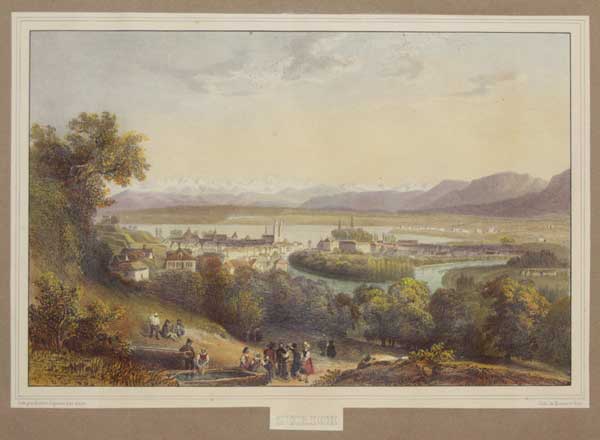 A view of Zurich, Switzerland, from a hill overlooking the town and lake. Men and women gather in the foreground, a woman is washing clothes in the water basin.