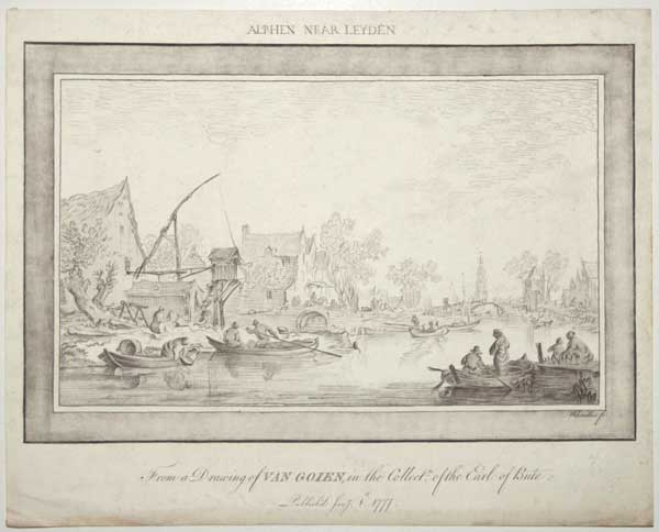A view of Alphen aan den Rijn from the river, after Jan van Goyen (1596-1656). Engraved by Captain William Baillie (1723-1810), who retired from the army in 1761 and devoted himself to printmaking and dealing. He specialised in imitating old-master drawings and prints, using a variety of printmaking techniques. Baillie also acted as the Earl of Bute's art agent. Ex: collection of The Hon. Christopher Lennox-Boyd.