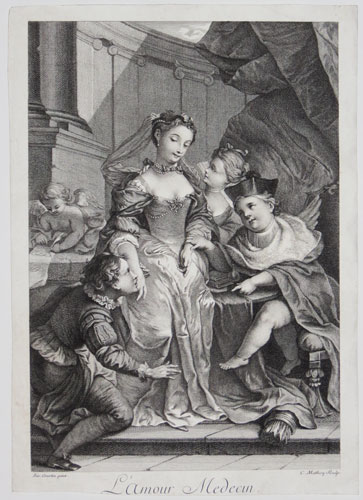 A romantic medical print. Cupid disguised as a doctor treating love between a young man on his knees pleading with a young maiden standing by a table; Cupid's arrows under his chair, another winged putto over by a column drawing. In the Académie nationale de médecine.