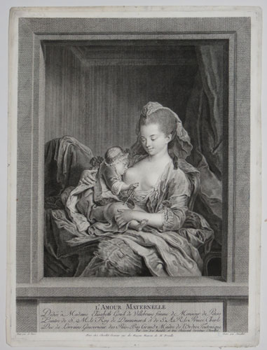 L'Amour Maternelle. Dédiée à Madame Elisabeth Gouël de Villebrune femme de Monsieur de Peters Peintre de S.M. le Roy de Dannemarck et de S.A.R. le Prince Charle Duc de Lorraine Gouverneur des Pais-Bas Grand Maître de l'Ordre Teutonique. Par son tres Humble et tres Obeissant Serviteur Chevillet.