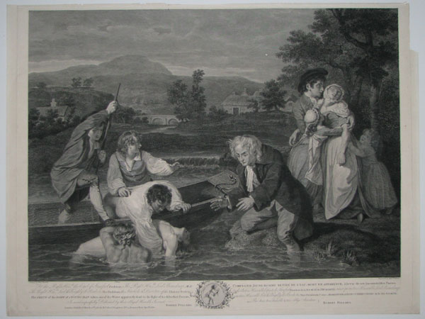To the Right Hon.blr the Earl of Stamford, President, The Right Hon.ble Lord Beauchamp, M.P. The Right Hon.ble Lord Willoughby de Broke, &c. Vice Presidents, the Stewards & Director of the Humane Society. This Print of the Body of a Young Man taken out of the Water apparently dead in the fight of his distressed Parents, Is most respectfully Dedicated, by their obliged Humble Servant. Robert Pollard. Corps d’un Jeune-Homme Retiré de l’Eau, Mort en Apparence, a la vue de ses inconsolables Parens. Dedié au très Honorable le Comte de Stamford, Président de la Société de l’Humanité : ainsi qu’au très Honorable Lord Beauchamp, au très Honorable Lord Willoughby de Broke &c. Vice-Présidents, & aux Administrateurs & Directeurs de la dite Société. Par leur très humble & très obligé Serviteur. Robert Pollard. [&] To the King’s most excellent Majesty, Patron _ The President, Vice Presidents, _ The Stewards & Directors of the Humane Society; This Print of The Young Man restored to Life Is most humbly Dedicated, by his Majesty’s Dutiful Subject & Servant, Robert Pollard. NB. This Society was instituted in the Year 1774, and in the space of 13 Years, has restored 897 Person to their Friends & the Public. Le Meme Jeune-Homme Rendu a la Vie. Trés humblement Dédié au Roi Protecteur de la Societe de l’Humanité ainsi qu’aux Président, Vice Présidents, Administrateurs & Directeurs de la dite Société, Par de sa très excellente Majesté. Le très humble, très obeissant & très-soumis Serviteur & Sujet, Rob.t Pollard. NB. Cette Société a été instituée en l’Année 1774 : et dans l’espace de 13 Ans, a rendu 897 Personnes à leurs Parents & au Public. [Under image:] Dr. Lettsom, the Person introducing the Mother. Dr. Harris, sitting on the Bed supporting the Young man.