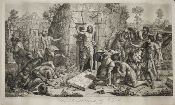 The Resurrection. "In The End Of The Sabbath, As It Began To/ Dawn Toward The First Day Of The Week,/ Came Mary Magdalen And The Other Mary To/ See The Sepulchre.__And, Behold, There/ Was A Great Earthquake: For The Angel Of The [left] Lord Descended From Heaven, And Came And/ Rolled Back The Stone From The Door. __/ His Countenance Was Like Lightning, And His/ Raiment White As Snow; And For Fear Of Him The/ Keepers Did Shake, And Became As Dead Men." Vide St. Matthew.