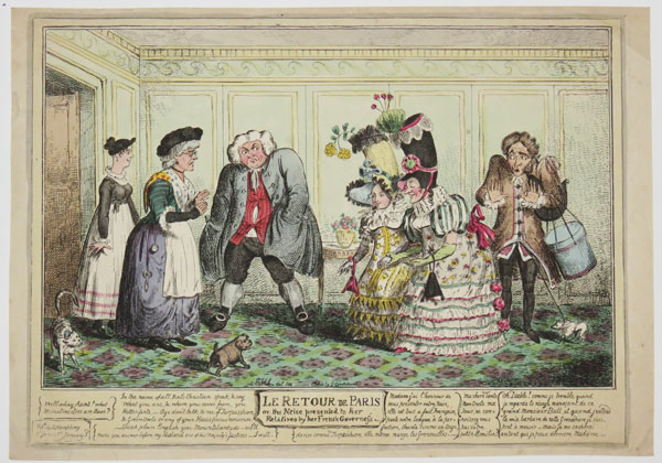 A stout lady pours tea on to a plate, missing the cup, in her amused astonishment at the appearance of her very fat and jovial husband who sits opposite her, wearing a hat burlesquing the French fashion, coat open over a wide expanse of horizontally striped waistcoat, and plain white trousers. The husband has obviously taken on too many French airs. The satire was originally published by George Humphrey in 1827. This reissue comes from 'Cruikshankiana, an Assemblage of the Most Celebrated Works of George Cruikshank'. See BM Satires 15465 for the first issue.