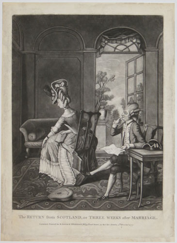 A young couple sit awkwardly, the wife faced away from her husband, demonstrating that the honeymoon period has definitely ended. The tightening of marriage regulations in England in the 18th century prevented couples under the age of 21 from marrying without their parents consent. This gave rise to the phenomenon of young couples marrying over the border in Scotland, which inspired many satirical prints depicting both the joys and perils of impulsive decisions. Ex: collection of the Late Hon. C. Lennox-Boyd; BM Satires 4625
