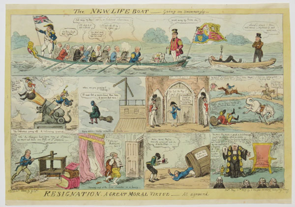 Nine designs in three rows, relating to the changes in the Government of George Canning. The main image, 'The New Life Boat' taking all of the top row, shows George IV being rowed by his cabinet, including Canning, Lyndhurst and Wynn. The other eight satires, resignations, relate to Wellington, Melville, Bathurst, Elton, Scarlett, etc. Bathurst is crawling out of a barrell marked from the colonies. Australian interest. BM Satires 15391.