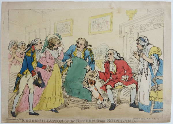 An interior scene showing the reconciliation of a newly-wed couple and the bride's family following her elopement to Scotland. The bride wipes her eyes while her father and mother regard the couple's entrance with shock, two servants clasp their hands in delight in the doorway. For a 1785 version see BM 9669.