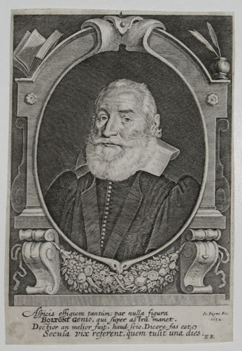 Portrait of Robert Bolton, half length in an oval in architectural frame, full beard, wearing high collar and gown. Frontispiece to his 'Last and learned work of the four last things' (1632). Robert Bolton (1572-1631) was a Puritan divine; an English clergyman and academic, noted as a preacher. On James I's visit to Oxford University in 1605, he was appointed to hold a disputation in the royal presence on natural philosophy, and his majesty was loud and frank in laudation of Bolton. He was also appointed lecturer in logic and moral and natural philosophy. Ex Collection: R. Hobson of Hove.